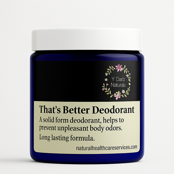 “Introducing ‘That’s Better Deodorant’ from Y’Darb Naturals. This non-aluminum deodorant is designed to keep you fresh all day long. With its natural ingredients and invigorating scent, it doesn’t just mask orders – it neutralizes them. Stay confident and stink-free with ‘That’s Better Deodorant’.” Say goodbye to harsh chemicals and hello to all-day freshness with ‘That’s Better Deodorant’ from Y’Darb Naturals. Our non-aluminum formula is gentle on your skin but tough on odors, giving you the confidence to tackle your day.”